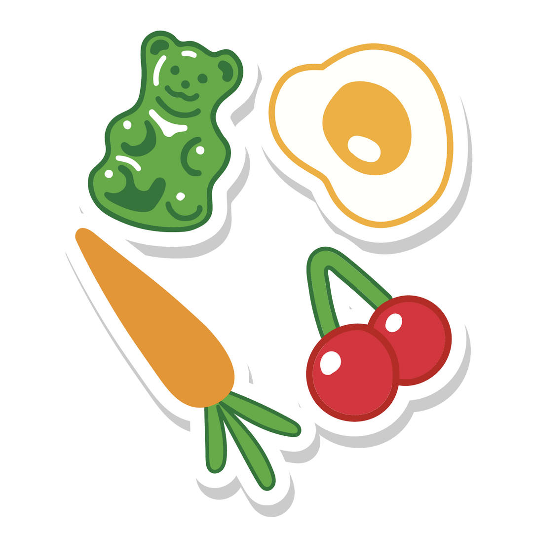Ingredienti: sciroppo di glucosio, zucchero, gelatina; acidificante: acido citrico, acido malico; umidificante: glicerolo; sciroppo di zucchero invertito; gelificante: pectine; aromi; regolatori di acidità: citrati di sodio; concentrato vegetale: rafano, ribes nero, carota, coloranti: E120, E122, E129. *E122, E129: Può influire negativamente sull’attività e l’attenzione dei bambini.